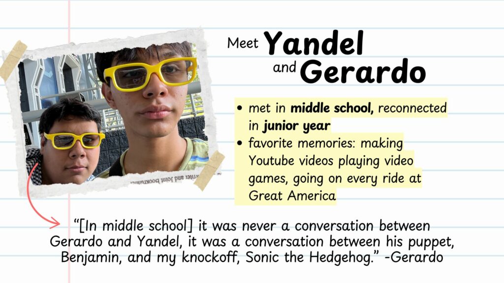 Yandel Hernandez and Gerardo Ortiz’s friendship developed unexpectedly. Although they met in middle school, they had their first face-to-face conversation in sophomore year. Due to Yandel’s social anxiety, the only way he would talk to others in middle school was through a sock puppet, and Gerardo gladly conversed back through his stuffed animal. After being separated by multiple school transfers, Yandel and Gerardo reunited at M-A and have strengthened their friendship ever since. “He’s my best friend,” Yandel said.