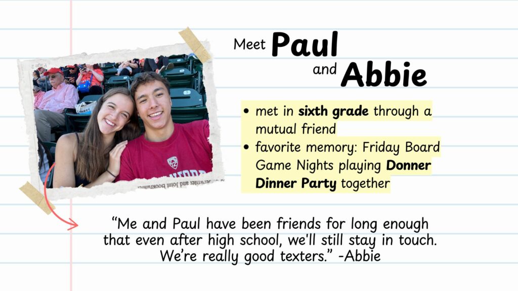 Paul Whelan and Abbie met through a mutual friend in sixth grade. They have been close ever since, from eating lunch together in the F-Wing as freshmen to laughing over Friday board game nights. “I’m the person that introduced Paul to Donner Dinner Party,” Abbie said. “Paul is a terrible player and a wonderful person to play with.”