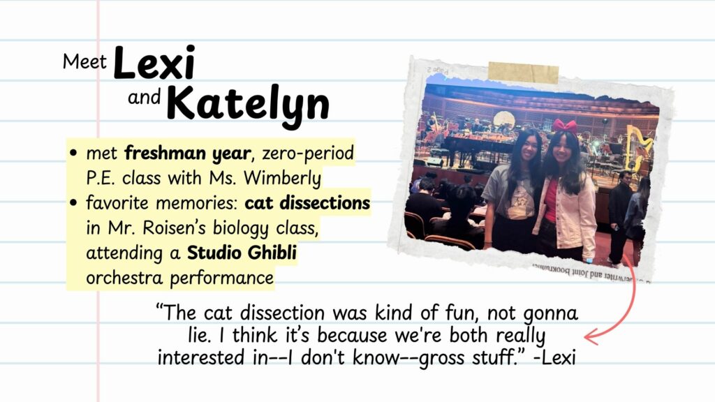 Katelyn: “Before, I was definitely very much a ‘work hard’ person. I thought that school was school—I should just get all my stuff done. But, after I met Lexi and my current friend group, I started hanging out more after school.”