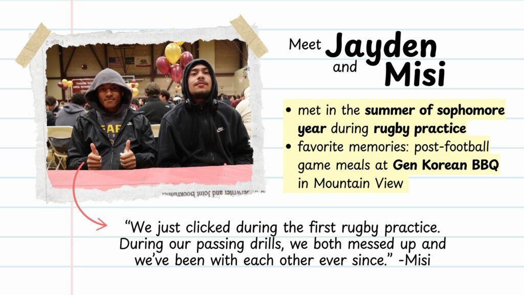 Through rugby and football, practices before games and meals after, Jayden and Misi have bonded over the past two years. “We had a lot of similar interests, so I felt like it was easy for us to get along,” Misi said.