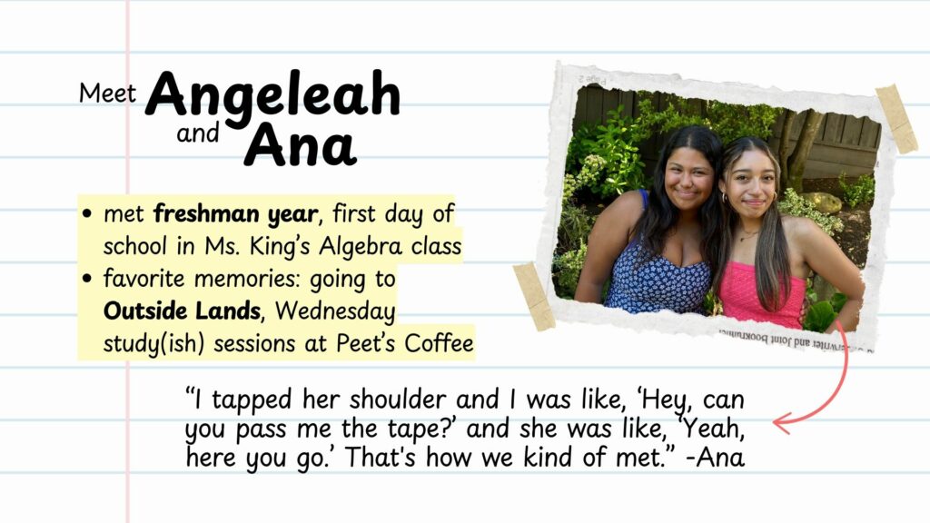 Angeleah and Ana Guzman met in Ms. King’s Algebra I class during their freshman year. “I tapped her shoulder and I was like, ‘Hey, can you pass me the tape?’ and she was like, ‘Yeah, here you go.’ That’s how we met,” Ana said.