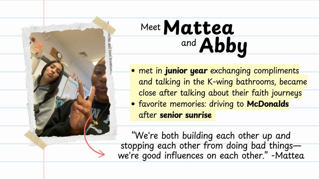 Mattea Harris and Abby met exchanging compliments in the K-wing bathroom. “I was the one that would talk to her,” Abby said, “I would compliment her and she would respond very awkwardly,” she jokingly added. Although they grew closer with each interaction, their friendship clicked after they began having deeper conversations.