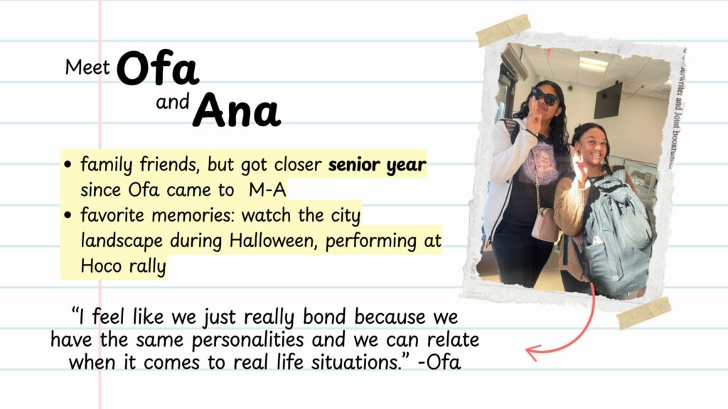 “We’ve known of each other since middle school and have been locked in ever since,” Ana Esafe said about her friendship with Ofa Tahaafe. Originally introduced to each other through family friends in middle school, they grew closer after Ofa transferred to M-A.