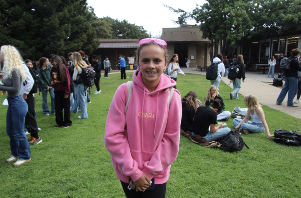 Freshman Hadley Refuerzo Collins’ spirit was all about the color pink. Sporting a pink hoodie, sunglasses, and face paint, Collins’ outfit popped with vibrant ’70s colors. “I feel like when everybody dresses up, it creates unity and just happy lives,” she said.