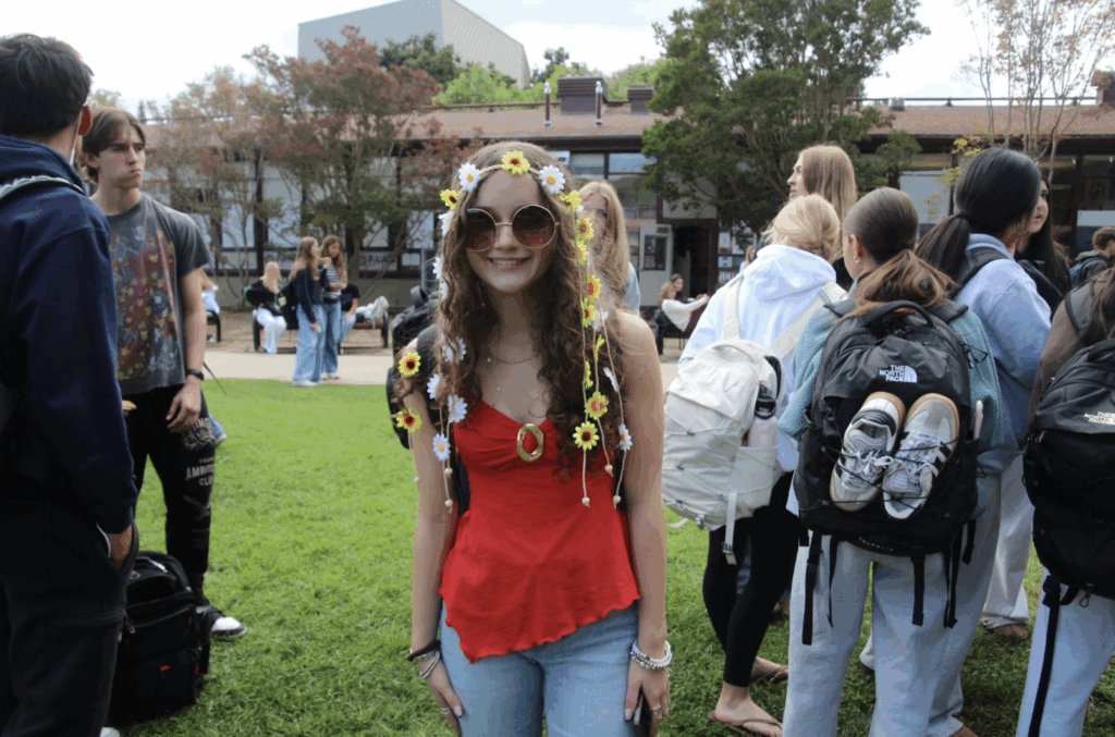 Freshman Lela Eaton’s outfit consisted of flared jeans, Converse sneakers, a red halter top, and a flower headband to top it all off. “It’s not weird to dress up,” she said. “If you dress up, more people will dress up.”