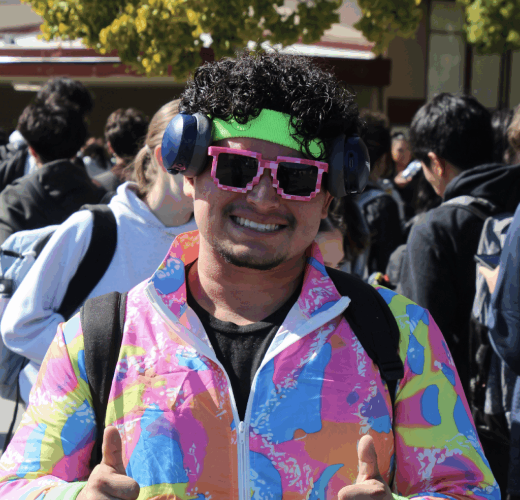 Sophomore Jaime Parada Hernandez sported all the classic neon colors, wearing a track suit with patterns of bright pink, green, and blue. Hernandez also wore neon green sweatbands and pink sunglasses. “I do my best to dress up because I think it’s fun,” he said.