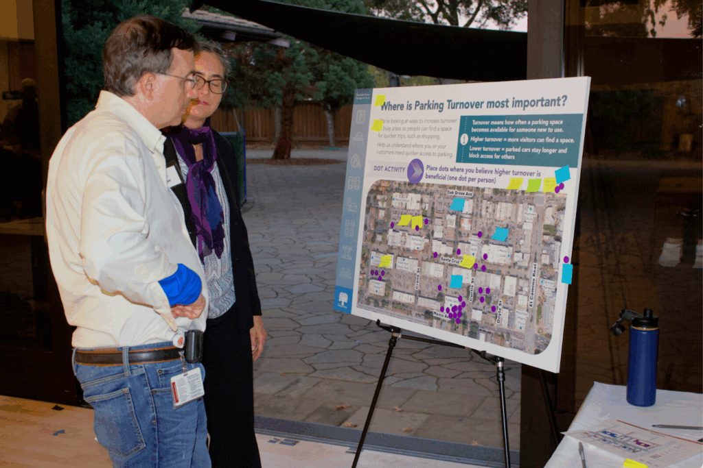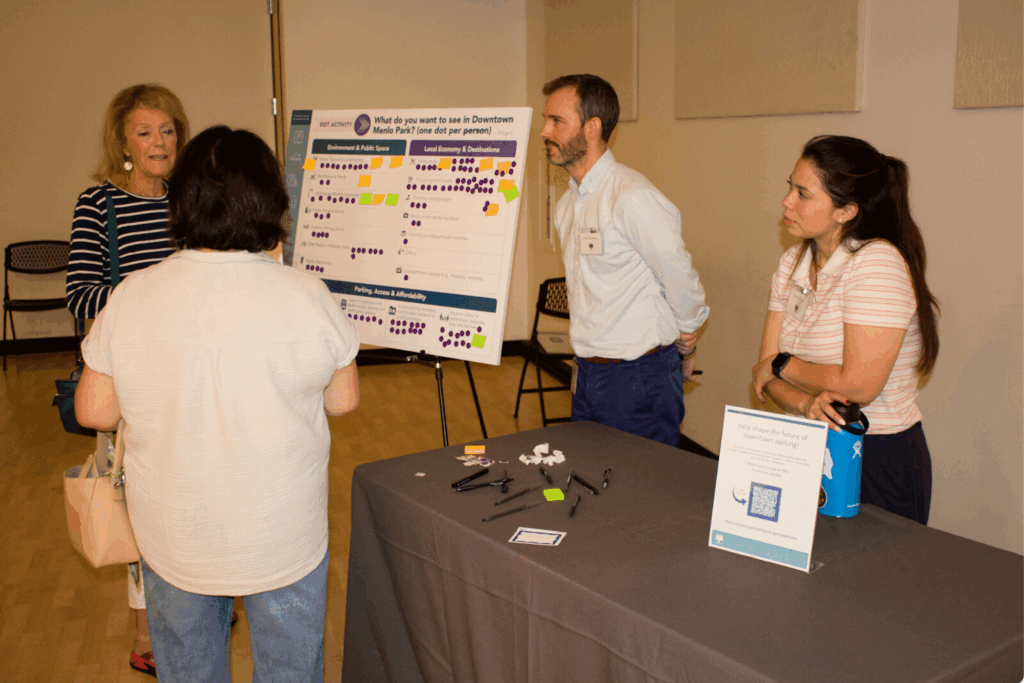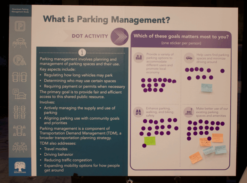 The City of Menlo Park hosted an open house to explain research collected during its recent Downtown Parking Management Study and gather feedback on the future of parking, loading, and street space. On Sept. 25, city staff at the Arrillaga Recreation Center set up stations that displayed a variety of data and key terms from the study, inviting residents to answer questions on their stances on future parking policy.