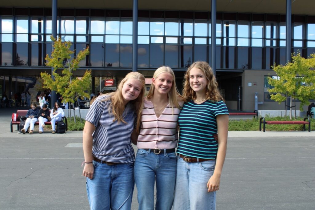 Sophomores Vanessa Polly, Grace Lobdell, and Anna Brown started the first couple days of fall with an assortment of playful colored stripes and a classic denim jean look. “I watched Gilmore Girls last night, and I actually took some inspiration from it and tried to match that vibe,” Lobdell said. Lobdell’s sweater is from Reformation, flip flops from Rainbow, and jeans from Seven.