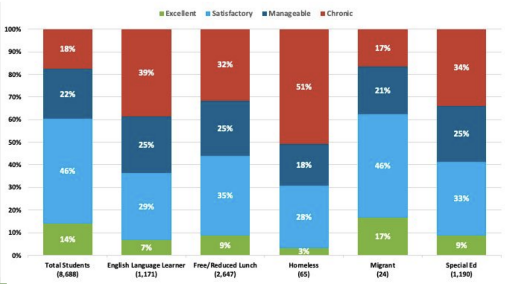 According to Dooley, Hispanic, Pacific Islander, and Native American attendance rates improved, and attendance rates of Black students increased by one percent. The largest group of students who are regularly absent from school are English Language Learners.