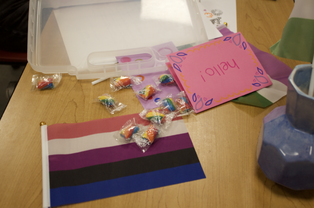 The room was filled with different pride flags, including transgender, non-binary, genderqueer, and genderfluid flags. They also displayed transgender flag-patterned bow pins, which students were able to take home. Finally, candy was handed out for students to enjoy and eat while working on the cards.