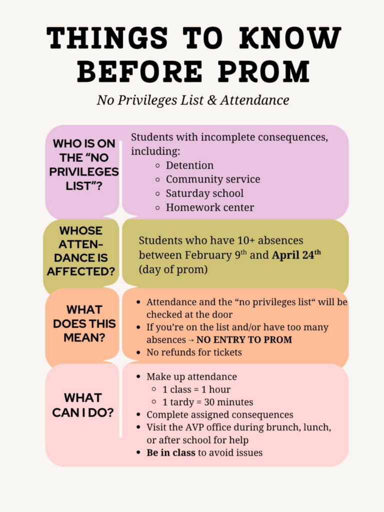 Because the District sets no clear consequences, enforcement falls to individual schools. For M-A specifically, students with more than 10 unexcused absences are put on the “No Privileges List.” Students on the list will not be allowed to attend certain school events such as prom.