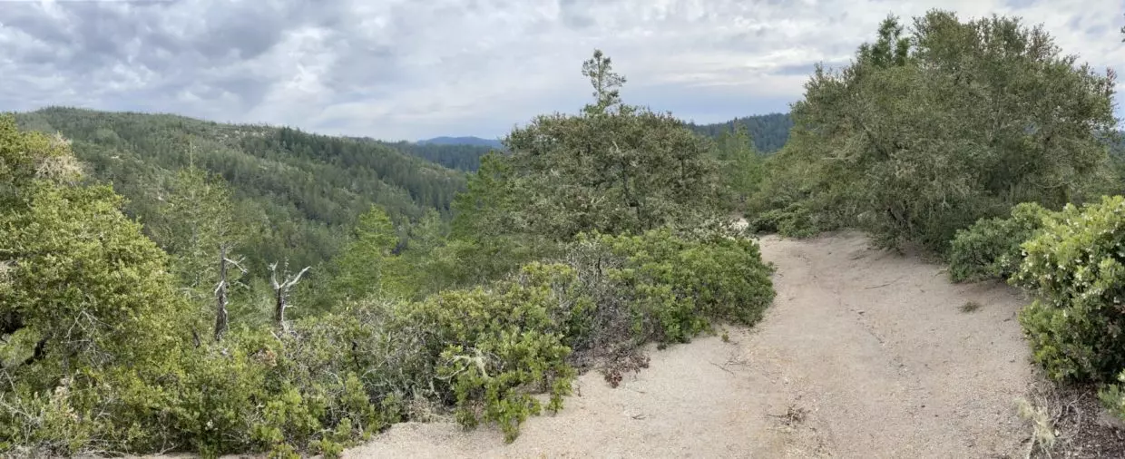 On ridge tops, the firs and redwoods give away to chaparral; the soil becomes Santa Margarita sandstone, the trees scrubs oaks.